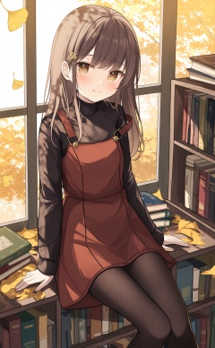 white_background,masterpiece,very aware,highres,absurdres,newest,best quality,loli,petite,high quality,chromatic_aberration,loli,loli,//,1girl,solo,brown_hair,long_hair,pantyhose,sitting,looking_at_viewer,book,smile,long_sleeves,autumn,shoes,window,hair_ornament,strap_slip,ladder,blush,autumn_leaves,black_footwear,closed_mouth,black_shirt,socks,shirt,yellow_eyes,brown_eyes,leaf,sweater,black_pantyhose,dress,book_stack,turtleneck,bookshelf,falling_leaves,tree,indoors,ginkgo_leaf,overalls,black_sweater,pinafore_dress,full_body,red_dress,brown_socks,brown_pantyhose,//,//,//,<lora:千道センリ——【noob】hans:0.8>,