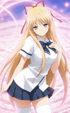 1girl, solo, long hair, looking at viewer, smile, blue eyes, skirt, blonde hair, thighhighs, bow, ribbon, very long hair, school uniform, hair ribbon, white thighhighs, zettai ryouiki, magic circle