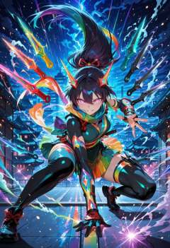 crazy anime ninja girl, glowing throwing knives, rainbow color weapons, reverse rainbow, magical kunai, dynamic battle pose, crouching throw stance, glowing eyes, colorful trails, magical throwing weapons, explosive colors, anime style, urban rooftop, night battle, prism light, energy motion blur, sharp expression, glowing outfit details, colorful sash, chaotic magic, rainbow energy, cinematic lighting, epic pose, high detail, particles in air, high speed action, intense focus, neon background