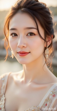 A majestic portrait of a goddess-like woman, set against the serene backdrop of a sunset-rimmed village by a river. Her face is bathed in soft, watercolor-inspired light, with intricate details on her eyebrows and eyes. Her hair, styled in a high updo, flows like silk down her neck. Her lips are painted a vibrant red, and adorned with delicate accessories that catch the fading sunlight. The focus is on her striking features, with a subtle smile playing on her lips as she gazes into the distance.
