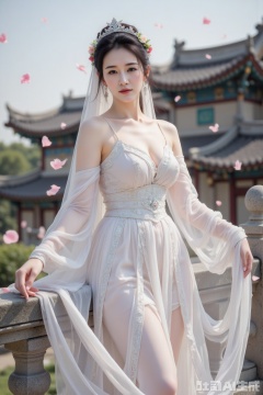 Ancient Chinese elegance unfurls before the vibrant backdrop of a sun-kissed day. A low-angle perspective captures the serene full-body portrait of a girl in silver-gauze attire, adorned with colorful floral headpieces and a semi-transparent veil, gently blowing in the wind. Her long black hair cascades down her back as she leans against a weathered gray stone railing, her silver crown glinting in the bright sunshine. The air is filled with pink petals dancing freely, framing her peaceful posture. Behind her, an ancient Chinese building rises, its layered eaves and colorful details drawing the eye. The cinematic texture and free-spirited atmosphere evoke a sense of timeless beauty.