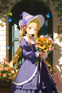 artist:ciloranko,1girl, flower, butterfly, bug, solo, holding, sunflower, dress, holding flower, long hair, broom, blue butterfly, pink flower, black dress, long sleeves, rose, hat, frills, yellow flower, green hair, bouquet, pink rose, holding bouquet, black headwear, window, brick wall, very long hair, umbrella, closed mouth, green eyes, frilled dress, witch hat, twintails, plant, outdoors, frilled sleeves, brown eyes, tulip, red flower, purple dress, standing, leaf, witch, lolita fashion, day, holding broom, red rose, puffy sleeves, looking at viewer, ribbon, expressionless, heart, holding umbrella, looking at animal, blush, glowing butterfly, sunlight, collared dress, cowboy shot, blonde hair, closed umbrella, stone wall, purple headwear, orange flower, indoors, artist name, bow, nail polish, hands up, pink nails, puffy long sleeves, vines, door, bottle, collar, frilled hat, pink ribbon, hat flower, purple flower, bonnet, blunt bangs, sidelighting, feet out of frame, blue flower, parasol, frilled collar, sidelocks, smile, frilled shirt collar, english text, long dress, purple butterfly, orange rose, sign, gothic lolita, animal, against wall, juliet sleeves