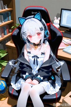 artist:ciloranko,1girl,solo,fake animal ears,white pantyhose,headphones,animal ear headphones,animal ears,rabbit hair ornament,red eyes,long hair,sitting,knees up,twintails,low twintails,white hair,pantyhose,frills,looking at viewer,hair ornament,bell,blush,bag,swivel chair,x hair ornament,indoors,closed mouth,neck bell,rabbit ears,sleeveless,jingle bell,off shoulder,hairclip,hair bow,white dress,on chair,collarbone,choker,bow,stuffed toy,bare shoulders,stuffed animal,frilled choker,box,chair,office chair,dress,hair over shoulder,black choker,collar,bookshelf,stuffed rabbit,feet out of frame,hair between eyes,white bow,monitor,parted lips,frilled dress,sleeveless dress,jacket,white camisole,gaming chair,grey hair,desk,shirt,blue bow,shopping bag,cardboard box,book,white shirt,black collar,hair intakes,camisole,star (symbol),open clothes,white thighhighs,mouse (computer),cat ear headphones,headset,sleeveless shirt,globe,black ribbon,sidelocks,shelf,:o,heart hair ornament,black bow,heart,cat hair ornament,very long hair,
