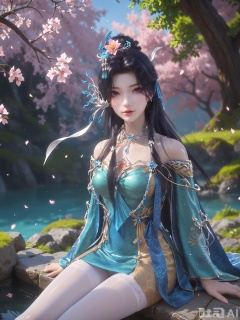 score_9,score_8_up,score_7_up,source_cartoon,source_anime,1girl,looking_at_viewer,realistic,Vivid Colors,bright environment,delicate water,hair_ornament,shiny skin,shiny hair,reflection,dress,extreme detail description,(upper body:0.3),put one hand on your chest,long_hair,(skindentation:1.3),bright,sunshine on face,light,sweating,light,glowing,sunshine,bright,reflection,(pale_skin:1.3),white pantyhose,sitting_down,black-hair,outside,peach blossom,stream,yllow dress,blue dress,floating ribbon,long silk scarf,chinese-style stole,
