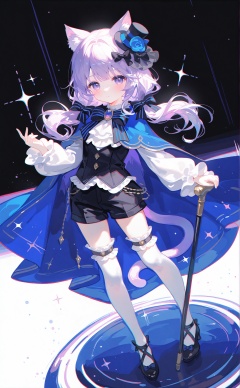 masterpiece,very aware,highres,absurdres,newest,best quality,loli,petite,high quality,chromatic_aberration,cinematic_angle,dutch angle,1girl,solo,long hair,looking at viewer,bangs,simple background,shirt,hair ornament,thighhighs,long sleeves,hat,white background,bow,holding,animal ears,twintails,jewelry,closed mouth,purple eyes,tail,white shirt,purple hair,flower,hair bow,frills,shoes,shorts,striped,puffy sleeves,cat ears,hair flower,bowtie,cape,black footwear,vest,high heels,white thighhighs,cat tail,animal ear fluff,short shorts,ascot,sparkle,black bow,low twintails,blue bow,black shorts,cat girl,brooch,puffy long sleeves,black vest,mini hat,striped bow,blue cape,cane,holding cane,