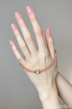 The image shows a close-up of a hand with neatly manicured nails, painted in a light pink or nude polish. The hand is holding a bracelet made of small, round beads that appear to be pink and gold in color. The bracelet is adorned with a single, round, clear stone in the center, surrounded by smaller gold-colored beads. The background is a plain, neutral gray, which helps to highlight the details of the hand and bracelet.