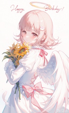 masterpiece,very aware,highres,absurdres,newest,best quality,loli,petite,high quality,chromatic_aberration,cinematic_angle, 1girl, nanami chiaki, flower, hair ornament, solo, happy birthday, wings, dress, sunflower, smile, bouquet, white flower, halo, medium hair, white dress, hair flower, alternate costume, feathered wings, alternate hair ornament, looking at viewer, angel wings, white wings, holding, from side, holding bouquet, yellow flower, brown hair, pink eyes, flipped hair, dated, angel, long sleeves, feathers, white rose, back cutout, white background, light brown hair, rose, clothing cutout, daisy, closed mouth, blunt bangs, simple background, hugging object, sunflower hair ornament, looking back, looking to the side, short hair, green flower, holding flower, brown eyes, hairclip, blush, white feathers, english text, ribbon, cowboy shot, puffy sleeves, bow, from behind, spaceship hair ornament, character name, backless dress, light particles, upper body, mini wings