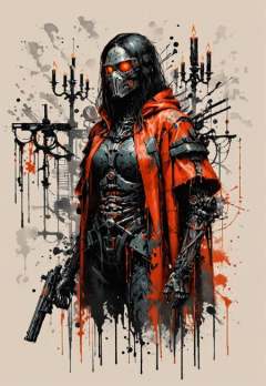 score_9, score_8_up, score_7_up, ink-painting, ink wash, ink wash painting, 1girl, female warrior, dark armor, gothic, plague doctor mask, red hooded cloak, multiple weaponssword, crossbow, claw-like extensions, skeletal handscandles, dark background, foggy, desolate environment, sinister design, intricate patterns