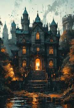 score_9, score_8_up, score_7_up, source_photo, low light, hd photo, depth of field, high definition, high contrast, darkness, cinematic, film grain, Rim Lighting, Long Exposure, DSLR, Fujifilm XT-4, 1girl, mature_female, ink-painting, ink wash, ink wash painting, gray_hair, cornrows, Violet henley shirt, heavy_breathing, legs_spread, castle_interior, Very wide shot, From behind, rating_safe, <lora:pony/dark_fantasy_pony:0.25000000000000006>