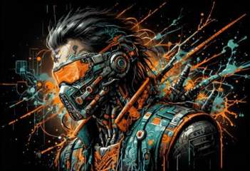 ink-painting,, ink wash,, ink wash painting,masterpiece, best quality, amazing quality, ultra aesthetic, absurdres, ultra-detailed, 32k rendering, depth of field, cinematic focus, dramatic shadows, newest, close up, look at viewer, dutch angle, strict combat pose, splash art blended with sketch illustration, 1man, cyberpunk warrior, athletic, muscular, defined abs and upper body, skin texture relief, black short dreadlocks, tribal beads woven in, neck-length, wears biomechanical mask inspired by African tribal art, engraved and symmetrical, matte metal with glowing red neon inlays, masked face expression unreadable, posture of dominance and silence, holds katana in one hand, leans on it with control, blade forward, dominant stance, open sleeveless orange plaid shirt fluttering in wind, dark tactical sweatpants, wrist guards, cyber-futurism, techno punk, tribal-mechanical fusion, graffiti ink with neon glow in traditional Japanese style (1.2), zentangle and cubist abstraction in background, dark palette with matte red, black, steel blue, ochre yellow, sinozick_illu, ma1ma1helmes_b_illu, <lora:Sinozick_style:0.55>, <lora:ck-shadow-circuit-IL:0.15>, <lora:ma1ma1helmes_b:0.25>, <lora:B-mixxxlora:0.35>, <lora:MeMax5-noob-vpred:0.15>, <lora:- iLL - the_edgy_mech_V3.0:0.7>dark background, foggy, desolate environment, sinister design, intricate patterns