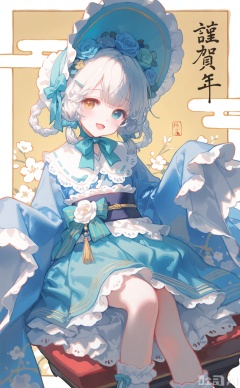 1girl, heterochromia, bonnet, yellow eyes, gloves, frills, japanese clothes, hair ornament, open mouth, white gloves, solo, frilled kimono, flower, fang, kimono, blue eyes, wa lolita, lolita fashion, frilled sleeves, blue kimono, 2024, skirt, skin fang, blush, wide sleeves, frilled gloves, bow, looking at viewer, egasumi, happy new year, hair flower, braid, socks, white socks, new year, hairclip, braided hair rings, blonde hair, smile, checkered clothes, aqua skirt, blunt bangs, hair rings, twin braids, frilled skirt, frilled headwear, claw pose, blue bow, kimono skirt, pleated skirt, beads, white hair, hair bow, long sleeves, waist bow, blue flower, short hair, aqua headwear, green bow, obi, white flower, frilled socks, :d, sash, ribbon, rose, nengajou, grey hair, striped bow, frilled bow, green flower, aqua eyes, aqua bow, sleeves past wrists, blue footwear, hand up, hat flower, feet out of frame, sleeves past fingers, white headwear, floral background, frilled hat, year of the dragon, floral print, kanzashi, lace trim, long hair, blue rose, blue skirt, furisode, hat