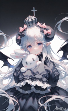 1girl, solo, wings, crown, stuffed rabbit, stuffed toy, long hair, cross, stuffed animal, bow, looking at viewer, horns, white hair, holding stuffed toy, black wings, hair bow, sleeves past wrists, latin cross, closed mouth, mini crown, blush, long sleeves, frilled sleeves, upper body, grey eyes, frills, demon wings, detached wings, hair between eyes, mini wings, gradient background, dress, purple bow, grey background, holding, bat wings, grey hair, white background, shirt, black horns, floating hair, grey dress, lolita fashion, hugging object, very long hair, demon horns, ribbon, simple background, purple eyes, grey theme, tombstone, black dress, hands up, sleeves past fingers, demon girl, muted color, straight-on, pink bow, :|, blue eyes, grey shirt, black bow, floating, hair ornament, sidelocks, frilled shirt, grey jacket, sweater