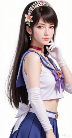 1girl,sailor senshi uniform,solo,jewelry,skirt,gloves,earrings,blue skirt,white gloves,sailor collar,bow,breasts,choker,elbow gloves,magical girl,back bow,covered navel,pleated skirt,looking at viewer,brooch,purple bow,heart brooch,red choker,miniskirt,closed mouth,large breasts,collarbone,red gemstone,tiara,cowboy shot,