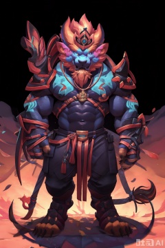 solo, long hair, looking at viewer, blue eyes, brown hair, 1boy, animal ears, jewelry, male focus, armor, muscular, feet out of frame, abs, crown, pectorals, muscular male, shoulder armor, bara, furry, pauldrons, furry male, bare pectorals, lion ears, lion boy,Rengar\(league of legends\),lion boy