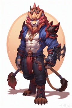 solo, long hair, looking at viewer, blue eyes, brown hair, 1boy, animal ears, jewelry, male focus, armor, muscular, feet out of frame, abs, crown, pectorals, muscular male, shoulder armor, bara, furry, pauldrons, furry male, bare pectorals, lion ears, lion boy,Rengar\(league of legends\),lion boy