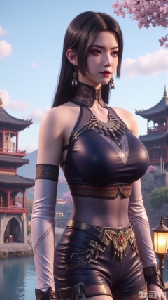 (masterpiece, best quality:1.2),1 girl, solo, long hair, black hair, hair accessories, clothing, cleavage cuts, long dress, jewelry, upper body, earrings. Background is outdoor, sky, clouds, water, trees, architecture, landscape, lantern, mountain, dragon, architecture, bridge, east Asian architecture, fog, pagoda,(huge breasts:2.99),(full breasts:2.99),,Xaili2,XyunxiaoYH5,XlinziyueXZ,XtuliH,Xbigbreasts,XMedusaQueen