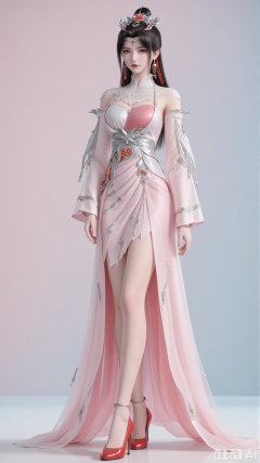 A soft gradient background (a blend of pink and blue), with a dreamy feel. The light and shadow highlight the transparency of the gauze fabric of the costume and the three - dimensionality of the character. The overall style is exquisite and realistic, like the CG quality of a xianxia game.,3d_character_lm