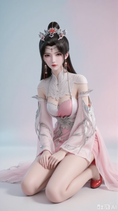 A soft gradient background (a blend of pink and blue) with a dreamy feel. The light and shadow highlight the transparency of the gauze fabric and the three-dimensionality of the character. The overall style is exquisite and realistic, resembling the CG quality of a xianxia game.