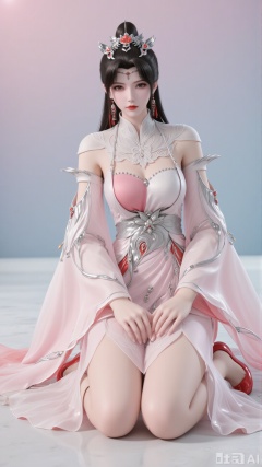 A soft gradient background (a blend of pink and blue) with a dreamy feel. The light and shadow highlight the transparency of the gauze fabric and the three-dimensionality of the character. The overall style is exquisite and realistic, resembling the CG quality of a xianxia game.