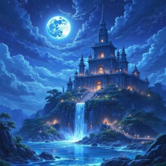 scenery, no humans, water, moon, night, waterfall, castle, sky, stairs, blue theme, fantasy, outdoors, night sky, building