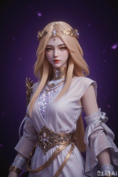 The image depicts a character with long, flowing blonde hair adorned with a golden headpiece featuring leaves and a central gemstone. The character is wearing a white garment with gold accents and a choker-like accessory around the neck. The background is a deep, dark purple, creating a contrast with the character's light-colored attire. The overall aesthetic suggests a fantasy or mythical theme.