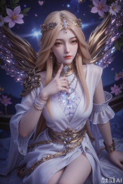 Super realistic and beautiful illustration, the girl sits on the altar of the starry dome composed of giant flowers. One hand gently supports the jaw and stares into the distance, and the other hand stretches to awaken the fluttering luminous flower seeds. The giant luminous stamen under the altar spreads the faint blue light from bottom to top, illuminating the star fog floating between her eyelashes covered with crystal teardrops and slightly opened lips. The background is an enchanted forest hanging upside down on the galaxy: glowing ferns droop like emerald waterfalls, suspended firefly dandelions and iridescent jellyfish-like spores, and aurora veils flowing among the silhouettes of the mountains in the distance. The colors are mainly silver purple, fog blue, and firefly powder, and the light and shadow are as hazy and ethereal as a dream.