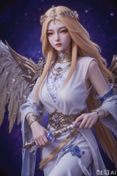 With large, gorgeous wings and a grand white dress, paired with a blue belt and gold decoration, wearing a gold bracelet on his left arm holding a staff with a glowing blue orb in his hand