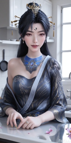 score_9,score_8_up,score_7_up,1girl,looking_at_viewer,realistic,1girl,Vivid Colors,bright environment,delicate water,hair_ornament,shiny skin,shiny hair,reflection,(wariza:1.2),dress,jewelry,flower sea,falling petals,extreme detail description,(upper body:1),put one hand on your side,kitchen,kitchen,long_hair,(skindentation:1.3),Fishnet stockings,black hair,yinyang