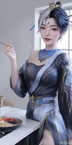 score_9,score_8_up,score_7_up,1girl,looking_at_viewer,realistic,1girl,Vivid Colors,bright environment,delicate water,hair_ornament,shiny skin,shiny hair,reflection,(wariza:1.2),dress,jewelry,flower sea,falling petals,extreme detail description,(upper body:1),put one hand on your side,kitchen,kitchen,long_hair,(skindentation:1.3),Fishnet stockings,yinyang,This is yinyang, this is a highly detailed digital artwork of an ethereal, fair-skinned woman with a pale complexion and striking red eyes, she has a distinctive hairstyle with black and white hair, adorned with gold and blue ornamental hairpins, she wears an elaborate, black and blue kimono-style dress with gold and white accents, featuring intricate patterns and a high collar with a blue, ornate jewel at the center,