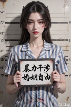 主体特征:图中肥美丽女孩双眼微眯眼神桀骜,嘴巴紧闭表情严肃,全身伤痕累累,捧着一块标牌。