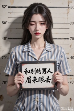 主体特征:图中肥美丽女孩双眼微眯眼神桀骜,嘴巴紧闭表情严肃,全身伤痕累累,捧着一块标牌。