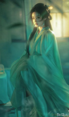 在柔和的灯光与梦幻的氛围中,一位身着青绿色唐装的女子全身入画。她肌肤如雪,容颜如花般娇艳动人。女子气质空灵出尘,仿佛不沾染尘世烟火,却又兼具妩媚妖娆之态,魅惑人心。同时,她散发着清冷孤傲的气息,让人难以接近,举止优雅神秘,令人心驰神往。灯光从侧面洒下,勾勒出她优美的身姿。摄影风格,定焦镜头,浪漫渲染,柔和的侧光,清新色调,16K。