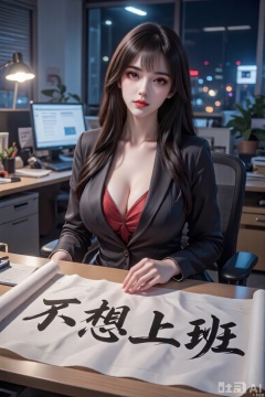 一个女孩,办公室女郎,身材丰满,着装性感,坐在办公桌前,办公桌上平铺了一张宣纸,在宣纸上写着黑色毛笔大字“不想上班”,夜晚,真实照片,冷暖对比,强对比度,电影光效,超高清晰度,丰富细节,