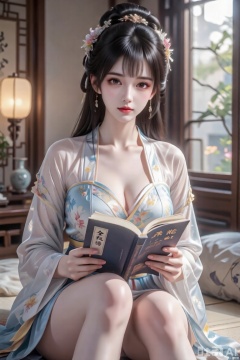 杰作,质量最好,质量上乘,,大胸,(黑发:1.4),(大长腿:1.3),(细腿:1.3),(完美眼睛:1.7),汉服,她坐在房间里看书,书名写着“***”三个大字,女人把头发梳成复杂的高髻,装饰着花卉配饰,她穿着一件浅蓝色和黄色的白色花卉图案的韩服, 这件衣服有长袖和透视设计,她直视着观众,图像的整体氛围宁静而如诗如画,唤起一种宁静和美丽的感觉,闭着嘴,lens_flare,reality_ray_tracing,质量最好,杰作,写实,质量最好,