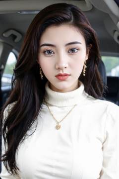 1girl, solo, long hair, breasts, brown eyes, black hair, turtleneck sweater, jewelry, sitting, closed mouth, earrings, necklace, lips, ground vehicle, realistic, nose, car interior, <lora:girlslikeflux_ljx:0.9>