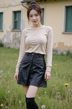 The image is a high-resolution photograph featuring a young woman standing outdoors in front of a weathered, light beige building with green shutters and a dark roof. The woman, likely in her mid-20s, has a fair complexion and straight, dark brown hair tied up in a casual bun. She is dressed in a cozy, light beige, long-sleeved sweater and a high-waisted, black leather skirt that falls to her knees. Her outfit is complemented by black knee-high socks, adding a touch of contrast. She stands in a field of tall, green grass and wildflowers, with a few dandelions and small yellow flowers scattered around her feet. The background shows the building's peeling paint and chipped plaster, indicating a state of neglect. The overall mood of the photograph is serene and slightly melancholic, enhanced by the soft, natural lighting and the rustic setting. The woman's expression is neutral, with a slight smile, and her body language is relaxed, leaning slightly to her left. The image captures a moment of quiet contemplation in a seemingly abandoned yet charming location.