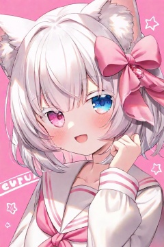 1girl, animal ear fluff, animal ears, blue eyes, blush, bow, cat ears, cat girl, character name, collarbone, colored eyelashes, hair bow, hand up, heterochromia, long sleeves, looking at viewer, neckerchief, open mouth, pink background, pink bow, pink eyes, pink neckerchief, sailor collar, school uniform, short hair, signature, simple background, smile, solo, star \(symbol\), virtual youtuber, white hair, white sailor collar <lora:ch-000057:1>