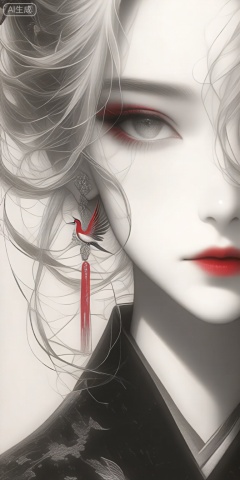 a close-up portrait of a young woman with striking features, captured in a monochromatic style with a focus on her delicate features and elegant attire, the subject, a 20-year-old woman with light skin and long, wavy, platinum blonde hair, is positioned in the middle of the image, looking directly at the viewer with a serene expression, she is wearing a black kimono with intricate patterns and a pair of red earrings with a bird design, adding a touch of elegance to her overall look, her eyes are accentuated with dramatic red eyeliner and red lipstick, creating a striking contrast against her pale skin, the background is a simple, neutral color, allowing the focus to remain on the subjects face and the intricate details of her outfit, the overall effect is one of elegance and sophistication, making the image a captivating and captivating piece of art,