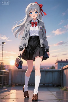 完美品质,高品质,杰作,最佳品质,惊人品质,非常美观,电影照明,最新,黎明,日出,从后面看,全景,looking_viewer,愉快的表情,AlisaMikhaylovna Cyql,1个女孩,独唱,长发,白发,ahoge,缎带,发带,红丝带,蓝眼睛,手包,摄影,电影照片,35mm照片,胶片,散景,专业,4k,高度细节,简单的几何形状,干净的线条,原色,(美丽的细节天空),学校风格,裙子,褶皱ed_skirt,AlisaMukhaylovna Cyql,1个女孩,独唱,长发,头发,刘海,两眼之间的头发,灰色头发,蓝色眼睛,丝带,发带,校服,蝴蝶结,红色蝴蝶结,领结,夹克,运动夹克,灰色夹克,衬衫,长袖,裙子,百褶裙,zettai ryouiki,黑色裙子,高跟鞋,白色高跟鞋,乐福鞋,鞋子,棕色鞋子,