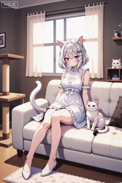 这张照片是一幅动漫风格的数字插图,描绘了一个有猫耳朵和尾巴的年轻女孩,坐在一个现代简约的房间里的白色沙发上。她有一头波浪形的白发和一双富有表现力的紫色大眼睛。她的衣服是一件白色无袖连衣裙,上面有花朵图案和蝴蝶结,她穿着白色的尖头。房间被温暖柔和的色调柔和地照亮,背景显示了一扇带透明窗帘的大窗户,阳光透过窗户照射进来,照亮了房间。有一个猫形的抓挠柱和一张上面有一只猫的小桌子,暗示着一只以猫为主题的俏皮猫。它有一个小而表情丰富的腿上抱着一只毛茸茸的白猫。整体氛围宁静而舒适,带有一丝奇想和可爱。