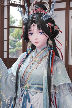 1girl, solo, long hair, looking at viewer, black hair, hair ornament, long sleeves, dress, jewelry, white_background,earrings, indoors, wide sleeves, facial mark, chinese clothes, tassel, shawl, forehead mark, hanfu,upper_body,dragon horn, transparent,
