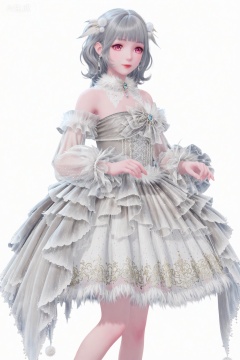 1girl, solo, short hair, bangs, simple background, hair ornament, red eyes, long sleeves, white background, dress, bow, bare shoulders, jewelry, closed mouth, standing, grey hair, earrings, frills, detached sleeves, blunt bangs, pink eyes, white dress, lips, see-through, feet out of frame, frilled dress, feathers, white bow, gem, lace, lace-trimmed dress