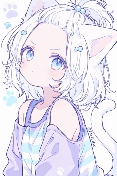 1girl, animal ears, bare shoulders, blue eyes, blue shirt, blush, cat ears, cat girl, cat tail, closed mouth, dated,, hair bobbles, hair ornament, paw print, purple shirt, shirt, simple background, solo, striped clothes, striped shirt, tail, topknot, twitter username, two-tone shirt, upper body, v-shaped eyebrows, white background, white hair,forehead