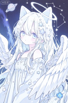 1girl, ((cat ears)) angel, angel_wings, blue_eyes, blue_flower, constellation, crescent, cross, dress, feathered_wings, flower, hair_between_eyes, hair_ornament, halo, long_hair, looking_at_viewer, planet, solo, star_\(sky\), star_\(symbol\), star_hair_ornament, star_print, starfish, starry_background, starry_sky, very_long_hair, white_feathers, white_hair, white_wings, wings