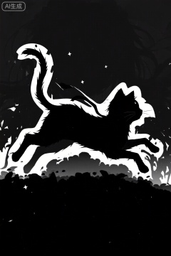 创建一个简洁而优美的剪影风格猫的插图,使用深色背景和浅色轮廓,强调猫的身体形态和姿态。保持线条流畅且富有表现力,捕捉猫的灵动与优雅。色调以黑色和白色为主,营造出强烈的对比效果,突出猫的独特美感。在构图上,让猫处于动态中,仿佛在跳跃或奔跑,增加画面的活力和动感。