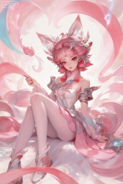 score_9,score_8_up,score_7_up,1girl,looking at viewer,solo,short hair,hair ornament,dress,bare shoulders,jewelry,pink hair,animal ear fluff,animal ears,shoes,Tattoo of the foot,streamers,blunt bangs,facial mark,forehead mark,multicolored hair,red hair,pink hair,pantyhose