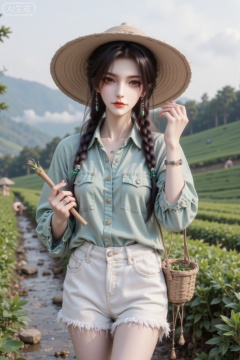 "The girl in the picture is like a sprig of fresh tea leaves in spring, exuding a clean and refreshing aura. Her long hair, a glossy black with subtle blue undertones, is braided into two loose 麻花辫(plaits) that hang over her shoulders, each braid decorated with small green bead accessories that jingle softly as she moves. A wide-brimmed bamboo hat sits on her head, its woven texture allowing dappled sunlight to filter through onto her hair, and a green ribbon ties under her chin, fluttering gently in the mountain breeze.