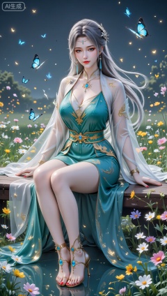 这幅CG插画呈现出一位充满仙气的女性形象。她有着一头飘逸的灰白色长发,额头上的精致吊链,尽显华贵。身着带有中式元素的服饰,上衣为青绿色,搭配金色花纹装饰的腰带,外搭轻薄的半透明白色飘带,增添了灵动之感。 她的腿部佩戴着精致的金色脚饰,脚饰上镶嵌着蓝色宝石,脚指甲涂成了红色。她优雅地坐在一片开满各色花朵的草地上,周围有许多蝴蝶飞舞,背景是带有朦胧感的深色天空,整体营造出一种清新、梦幻且充满自然气息的氛围,仿佛置身于仙境之中。