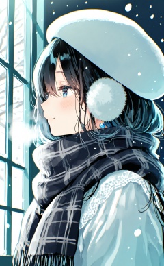 masterpiece,highres,absurdres,newest,best quality,high quality,chromatic_aberration,//,1girl, scarf, solo, black_hair, window, white_headwear, plaid_scarf, long_hair, black_scarf, hat, blush, smile, earmuffs, closed_mouth, plaid, upper_body, breath, snowing, winter, enpera, snow, beret, jewelry, winter_clothes, blue_eyes, from_side, hair_between_eyes, light_smile, fur_trim, earrings, fur_scarf, indoors, white_shirt, portrait, lace_trim, white_scarf, looking_ahead, shirt, day//,//,<lora:chun_paretto——【noob】hans:0.8>,