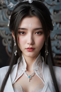 图像中显示了一个长长,直发的女人。她穿着一件白色传统的中国服装,带有复杂的图案。她的头发上装饰着银色发夹,她的头发上有珍珠和水晶细节的长长的耳环。她的眼睛大而富有表现力,额头上有一个小而复杂的设计。她还戴着一条精致的项链,中央有一个蓝色的宝石,周围是银色的装饰。背景是模糊的,但似乎是一种传统的中国环境,带有蓝色和白色的装饰元素。图像的整体风格优雅而精致。